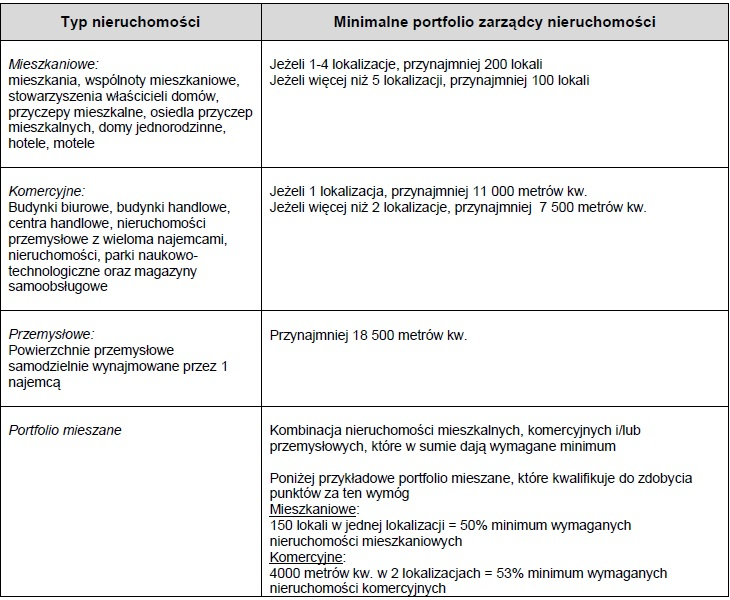 - Portfolio nieruchomości, którym kandydat zarządzał w każdym zgłoszonym roku musi mieć minimalną wymaganą wielkość (patrz wielkości portfolio w tabeli poniżej) oraz